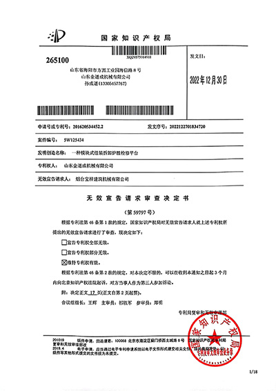 煙臺寶梓建筑機械有限公司抄襲的專利(專利號:201820409444.4),于2021年02月01日被國家知識產權局專利復審委員會宣告專利權全部無效。該公司惡意提起無效山東金道成機械有限公司有關專利的申請,經過國家知識產權局專利復審委員會的有關審查程序,根據《專利法》第46條第1款的規定,于2022年12月30日對我公司兩項專利做出宣告專利權全部有效的審查決定。